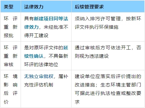 在建设项目环境影响评价管理过程中,环评重新报批、重新审核和环境影响后评价是三种不同的制度安排,它们在定义、适用情形、审批流程和要求、以及法律效力和后续管理要求方面存在显著差异。以下将结合相关法规文件内容逐一进行比较分析: